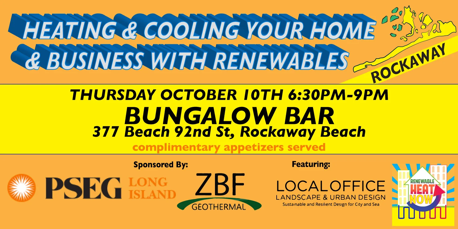 Join us on Thursday, October 10, from 6:30pm - 9pm at Bungalow Bar event space in Rockaway Beach, NY to learn about renewable heating and cooling options for your home and business coupled with energy efficiency, and building a resilient and sustainable Rockaway Peninsula. Complimentary Appetizers will be served. Doors open at 6:30pm